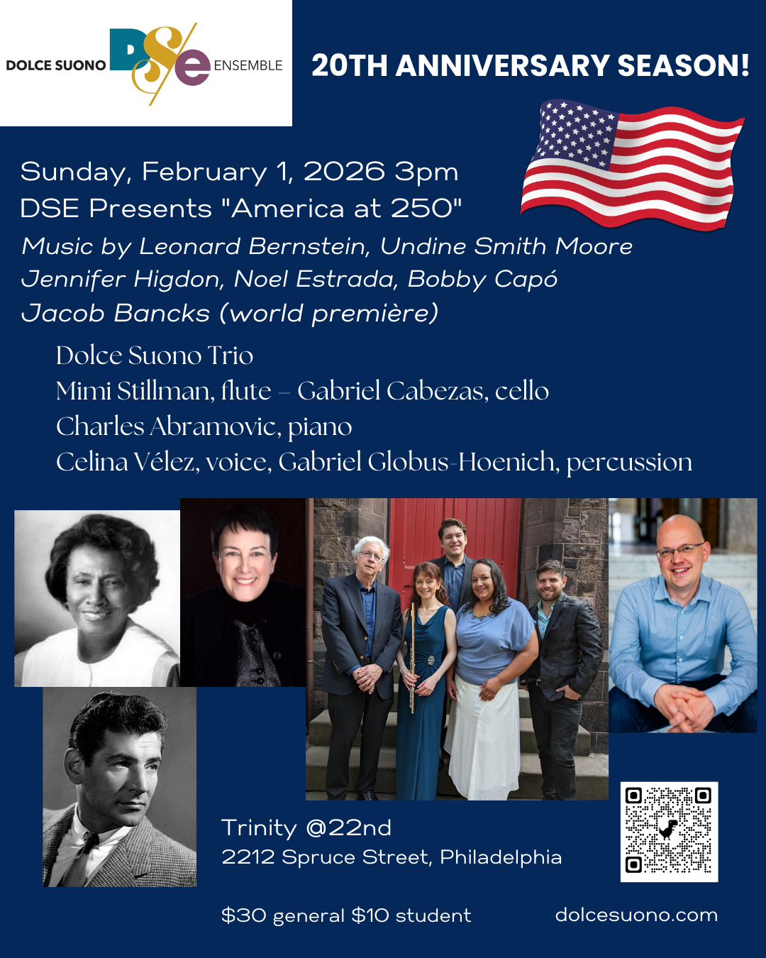 March 15, 2026 - Anniversary concert with works by J.S. Bach, Franz Schubert, Camille Saint-Saëns, Florence Price The Artists: Sarah Shafer, soprano Mimi Stillman, flute Ricardo Morales, clarinet Amy Oshiro-Morales, violin Charles Abramovic, piano