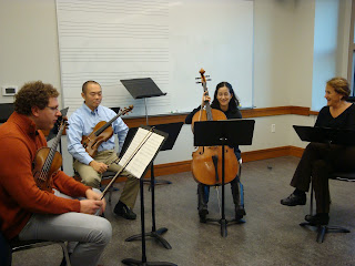 Lucy and Yumi share a funny moment during rehearsal of Viktor Ullmann’s Herbst Lied for voice, violin, viola, and cello.